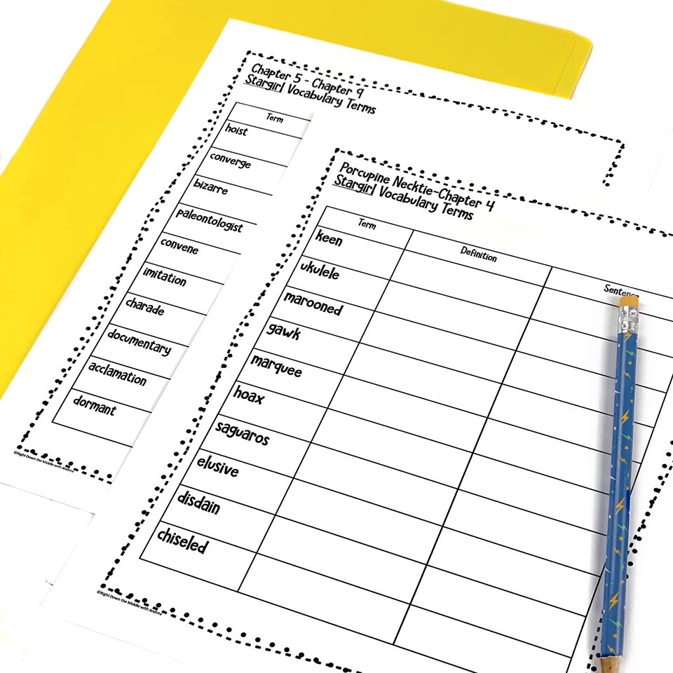 This is a novel study for Stargirl by Jerry Spinelli. It is packed full of resources, vocabulary, writing activities, reading skills, and comprehension questions. It is designed to use before, during, and after reading the novel.